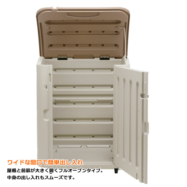 屋根と前扉が大きく開くフルオープンタイプ。ゴミステーション、物置として、飲食店や店舗、公共施設、ゴミ収集所、病院、会社などで幅広く使えます。