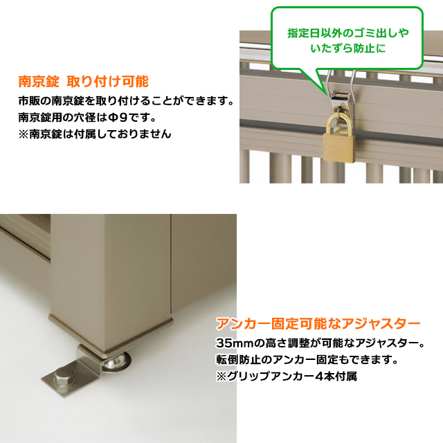 市販の南京錠を取り付け出来るので、指定日以外のゴミ捨てやいたずら防止に効果的です。
