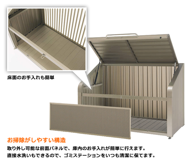 取り外し可能な前面パネルで、庫内のお手入れが簡単に行えます。直接水洗いもできるので、ゴミステーションをいつも清潔に保てます。